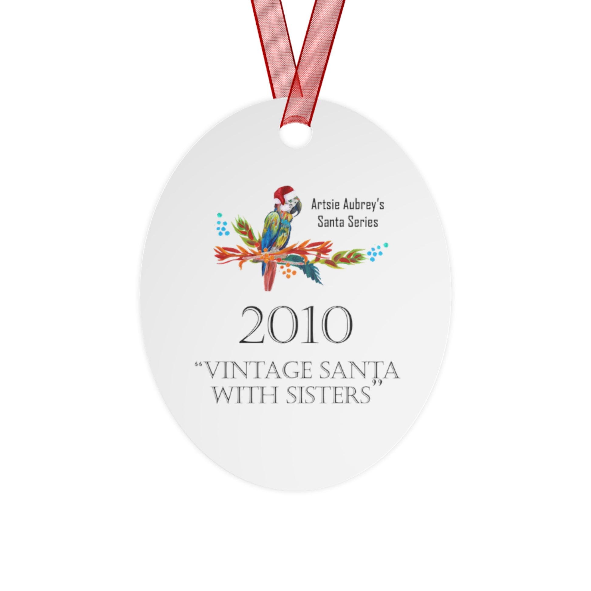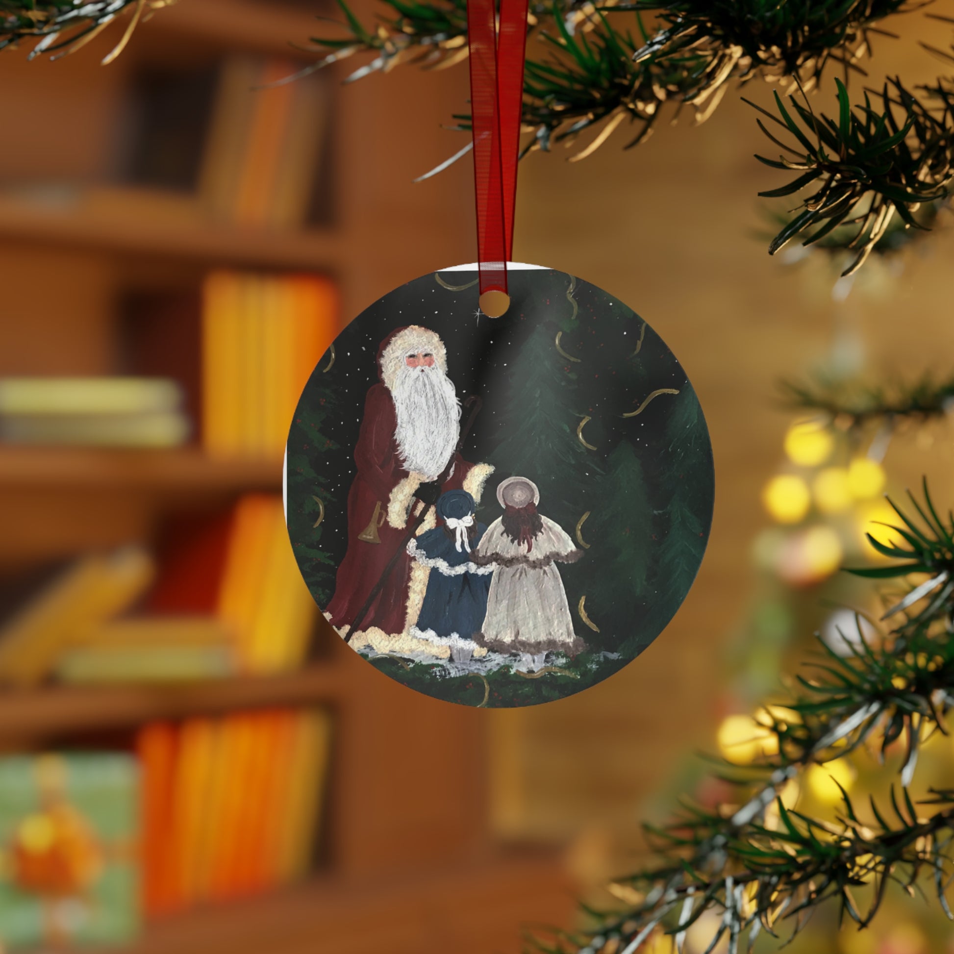Hand-painted nostalgia captured on glossy white metal. This oval ornament shows a vintage Santa flanked by two sisters beneath tall evergreens — soft brushstrokes, muted holiday tones, and a hint of snow. The image is printed on both sides so the scene reads from every angle. A pre-drilled hole and included red ribbon make it easy to hang on a tree branch, wreath, or holiday display. The durable aluminum base resists scratches and chips, keeping this keepsake bright year after year. Each listing contains a single ornament — a small, soulful accent that brings old-fashioned charm to seasonal gatherings and memory-making moments.
