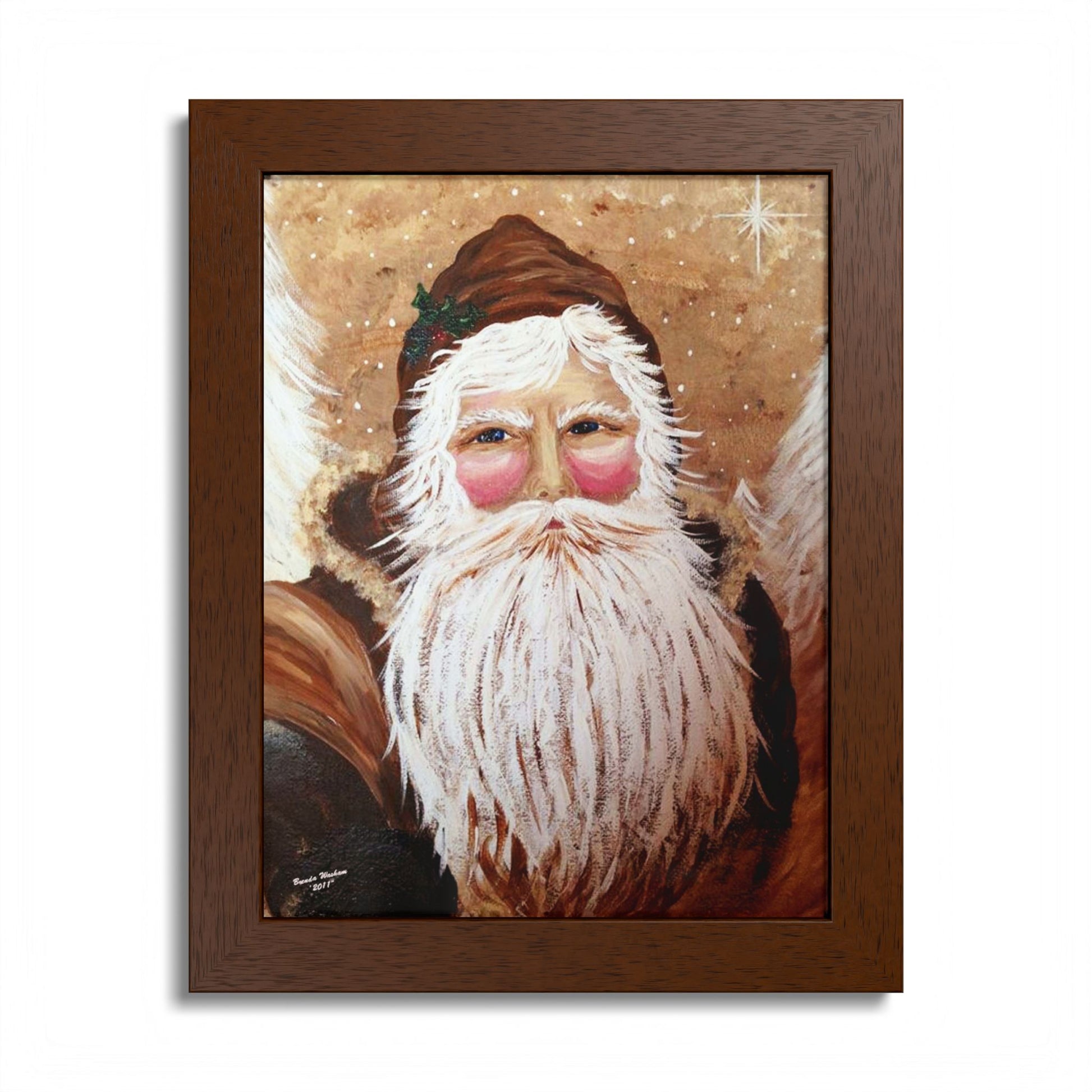 Warm, hand-framed poster with a cozy, vintage-inspired Santa portrait that brings a quiet, nostalgic glow to a holiday nook. The rich, wooden frame and semi-gloss print deepen the artwork’s earthy tones and soft highlights, creating a calm, storybook atmosphere. Hang it in an entryway to greet guests with gentle cheer, lean it on a mantel among candles and pine, or let it anchor a rustic gallery wall. The piece feels lived-in and comforting — like an old friend who arrives with winter stories and a pocketful of starlight.