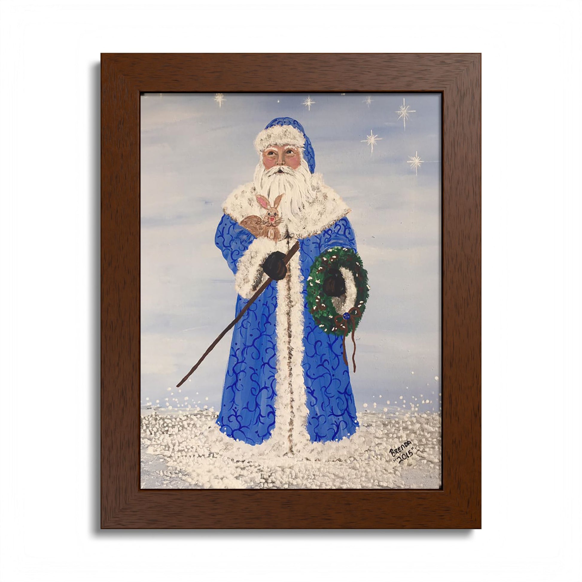 This framed poster brings a quiet, wintry stillness into a room. The hand-crafted wooden frame and clear Perspex insert showcase a richly colored print of a blue-clad Santa figure standing in a snowy field, wreath in hand and tiny stars glittering above. The semi-gloss 200 gsm paper and modern printing techniques keep blues vivid and details crisp, while the included hanging wire and enclosed back make it simple to place on a living room wall, hallway, or cozy reading nook. It reads like a page from a storybook — gentle, nostalgic, and made to be noticed without shouting for attention.