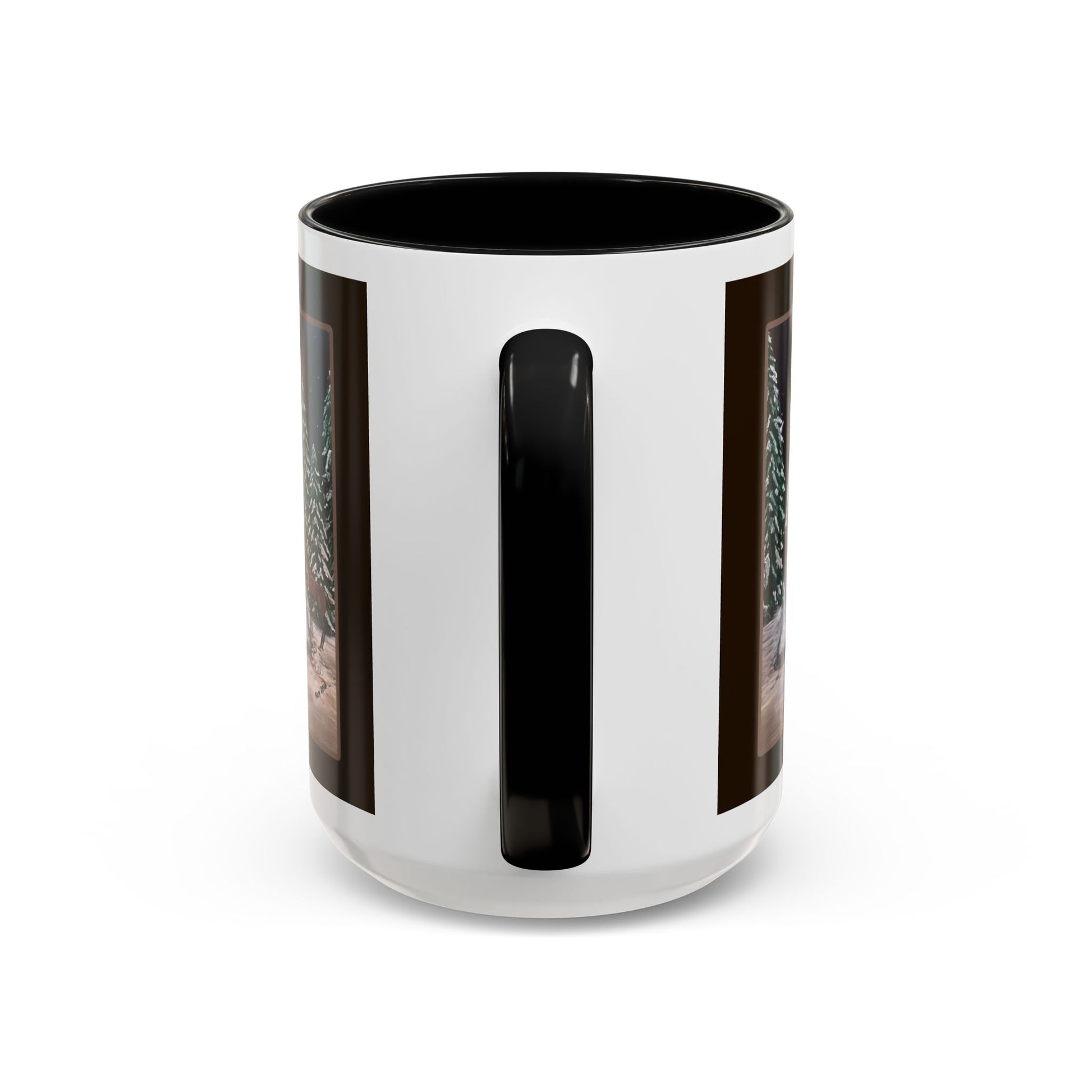 This glossy ceramic mug brings a quiet, wintry moment to your morning ritual. A soft, snowy scene wraps around the cup — a fur‑clad Santa walking with a gentle fawn beneath moonlit evergreens — rendered with rich, vivid colors that pop against the dark background and contrasting interior. The comfortable C‑handle and smooth glossy finish invite slow sips of coffee or cocoa while you linger over memories of woodland walks and calm holiday nights. It feels like a small keepsake: warm, nostalgic, and ready to join cozy mornings, mantel displays, or late‑night story sessions by the tree.
