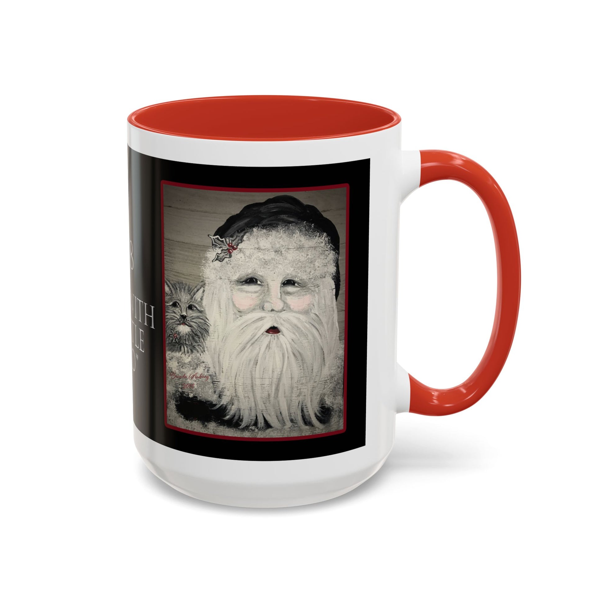 This glossy ceramic mug brings cozy holiday nostalgia to your morning routine. Deep black contrasts the vintage-style Santa illustration and his wide-eyed kitty, creating a quietly charming scene that feels like a warm memory. It sits heavy in the hand, the C-shaped handle offering steady comfort as steam rises and the design peeks around the curve. Use it during slow December mornings, while wrapping gifts, or to sip something strong after a long night of lights and laughter — the muted tones and classic imagery keep the moment calm and sentimental.
