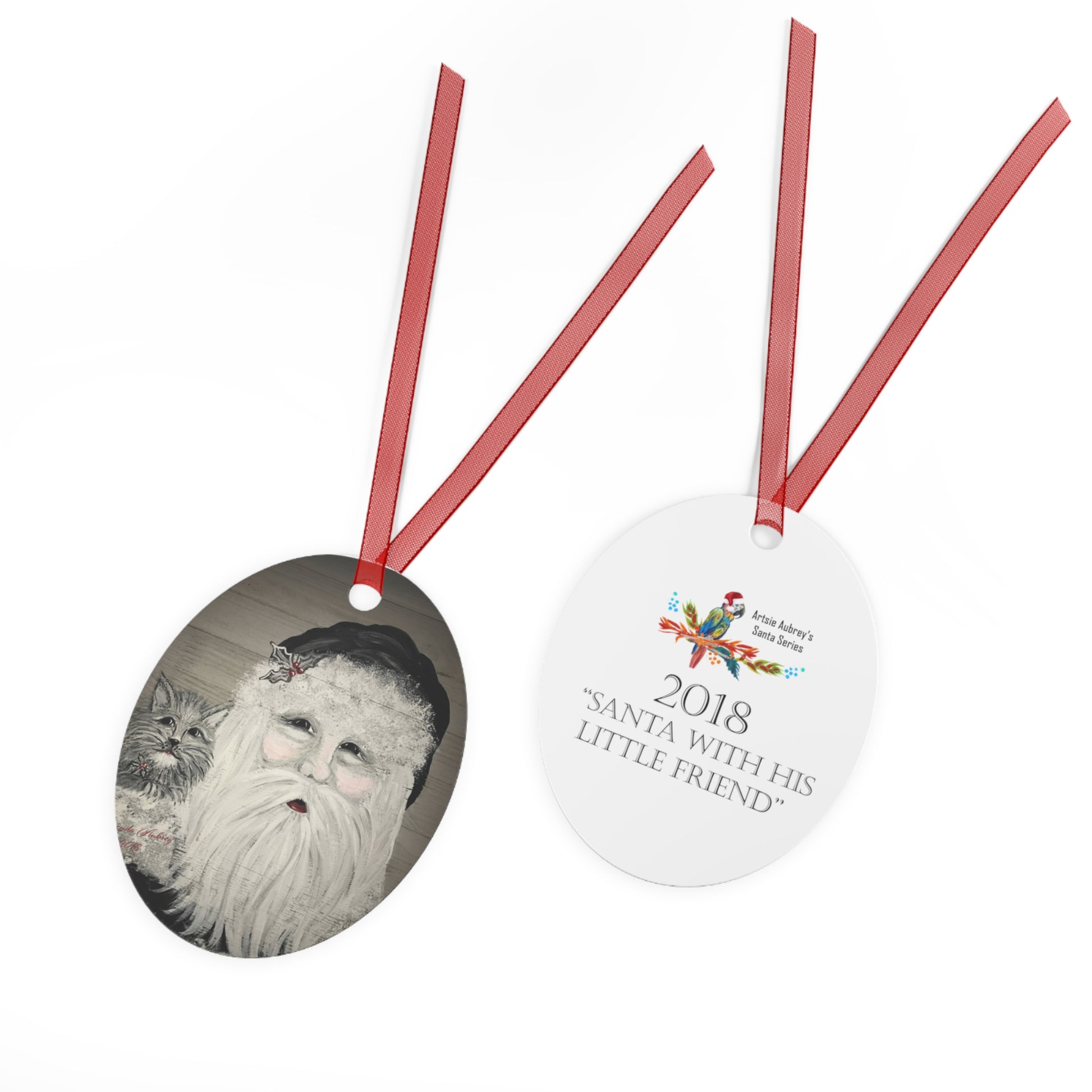 Warm, nostalgic, and quietly whimsical—this metal ornament brings a hand-painted Santa and his feline companion into your holiday moments. The glossy white aluminum showcases crisp, vibrant printing on both sides: one side features a softly shaded Santa with rosy cheeks and a fluffy white beard, the other side bears a charming logo and year text that feels like a keepsake note. Lightweight yet durable, the ornament hangs from the included red ribbon, catching tree lights and memories alike. It slips easily into seasonal traditions—tucked into a packed ornament box, hung on a branch that sees every childhood story, or gifted during a cozy winter visit—so each year when it reappears it carries a small, familiar joy.