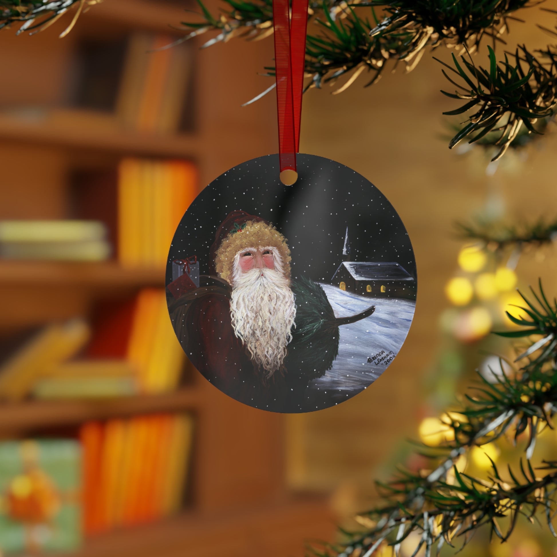 Artsie Aubrey's 2009 Church Santa. Bring a touch of holiday spirit to your home with our stunning Metal Ornaments! Perfect for adorning your Christmas tree, these vibrant and uniquely shaped decorations create a festive atmosphere that delights both young and old. Great for Gifts!